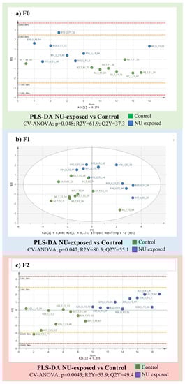 Only a selection of 10 metabolites based on VIP > 1.1 clearly separated the two groups of individuals (CV-ANOVA; p = 0.048; R2Y(cum) = 61.9%; Q2(cum) = 37.3%) (Figure 4a). Slightly clearer separation was observed in generation F1, where 13 metabolites selected based on their VIP > 1.2) created a PLS-DA model that could be validated (CV-ANOVA; p = 0.0047, R2Y(cum) = 80.3%; Q2(cum) = 55.1%) (Figure 4b). Regarding generation F2, a PLS-DA model could only be validated after selecting variables according to coefficients, after selecting seven metabolites as significant (Figure 4c). A validated model (CV-ANOVA; p = 0.0043; R2Y(cum) = 53.9%; Q2(cum) = 49.4%) clearly separated NU-exposed from non-exposed individuals.