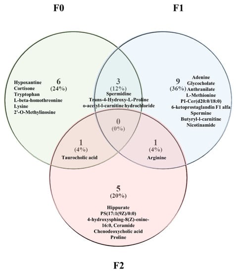 None of the selected variables was common to the three generations, indicating high multi-generational dimorphism related to NU exposure (Figure 5). However, three metabolites were common to generations F0 and F1: spermidine, Trans-4-hydroxy-L-Proline and 0-acetyl-carnitine hydrochloride. Generations F0 and F2, and generations F1 and F2, shared one common metabolite each, i.e., taurocholic acid and arginine, respectively.