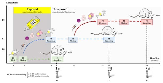 The multigenerational study design is already described in [,] (Figure 6). In summary, the present protocol includes three generations (F0, F1 and F2) of male and female rats (n = 20). Exposure to Natural Uranium (NU) started from birth and continued up to the age of 9 months in generation F0 (offspring of the parents’ generation). Generation F0 was mostly exposed to NU through lactation (human offspring absorbs approximately 5% of the mother’s daily uranium dose) and contaminated drinking water. All control groups of rats received uncontaminated drinking water ad libitum. F1 rats were contaminated in utero and through lactation until weaning []. After weaning, they drank uncontaminated mineral water. The last generation, F2, only received mineral water. Generation F2 was only exposed to uranium from parental (F1) germ cells.
