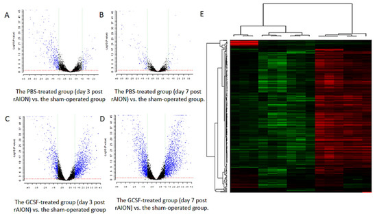 Gene expression profiles of the retina samples. (A–D) Volcano plot showing the differentially expressed genes in the PBS- and GCSF-treated groups. (A) The PBS-treated group (day 3 post rAION) vs. the sham-operated group. (B) The PBS-treated group (day 7 post rAION) vs. the sham-operated group. (C) The GCSF-treated group (day 3 post rAION) vs. the sham-operated group. (D) The GCSF-treated group (day 7 post rAION) vs. the sham-operated group. For each plot, the X-axis represents log2 FC, and the Y-axis represents −log10 (p-values). The differentially expressed genes are shown as red dots. (E) The heatmap of the hierarchical clustering of the differentially expressed genes. Up- and downregulated genes are represented in red and green colors, respectively. The differentially expressed genes were defined as having absolute FC > 1.5 and FDR < 0.1.