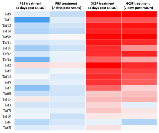 Heatmap of TBP-associated factors expressed in retina samples. After ON infarct, 18 TBP-associated factors were upregulated by GCSF treatment. There were 17 TBP-associated factors that were downregulated by PBS treatment. Genes were clustered into the regulation of cell survival based on gene expression over time. Up- and downregulation are represented in red and blue colors, respectively.