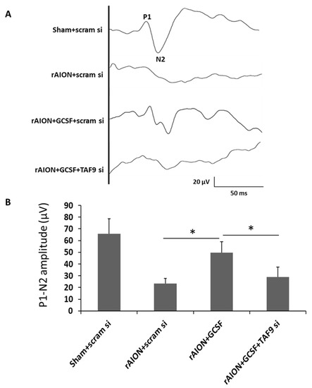 Effect of TAF9 knockdown on FVEP recording in the fourth week after infarct. (A) Representative FVEP wavelet in each group. (B) GCSF plus TAF9 siRNA treatment reduced the P1-N2 amplitude by 1.71-fold compared to GCSF plus scrambled siRNA treatment in rAION groups (* p < 0.05, n = 12 per group). Data are expressed as mean ± SD.