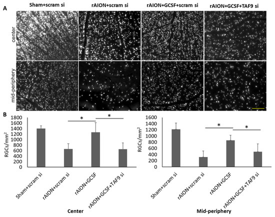 Effect of TAF9 knockdown on RGC density in the fourth week after infarct. (A) Representative RGC density of the central and midperipheral retinas in each group. The white spots in the representative figures are the Fluoro-Gold-labeled RGCs in the retina. (B) Bar chart showing the RGC density in the rAION induction and GCSF plus TAF9 siRNA-treated rAION group was significantly reduced in the central and midperipheral retinas compared to that in the rAION induction and GCSF plus scrambled siRNA-treated group (* p < 0.05, n = 12 per group; scale bar = 200 μm).
