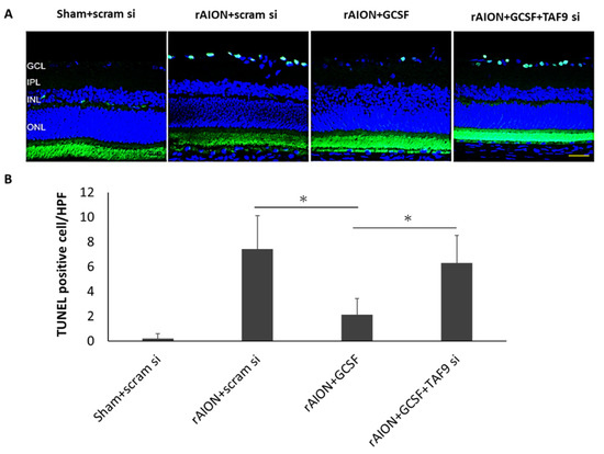 Analysis of RGC apoptosis in the RGC layer through the TUNEL assay in the fourth week after rAION induction. (A) Representative images of TUNEL staining. (B) Quantification of apoptotic cells per HPF. The number of TUNEL-positive cells in the rAION induction and GCSF plus TAF9 siRNA-treated group significantly increased by threefold compared to that in the rAION induction and GCSF plus scrambled siRNA-treated group (* p < 0.05, n = 6; scale bar = 50 μm).