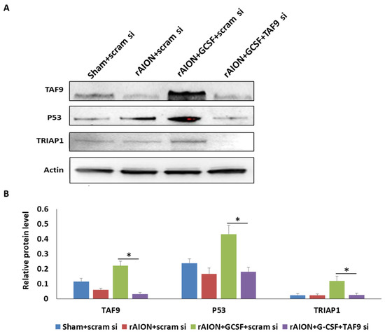 Western blotting confirmed that the rAION induction and GCSF plus scrambled siRNA-treated group exhibited the highest protein level of TAF9 compared with other groups (Figure 7, p < 0.05). GCSF plus TAF9 siRNA treatment significantly repressed TAF9 protein expression by 6.9-fold compared to GCSF plus scrambled siRNA treatment (p < 0.05). In the rAION induction and GCSF plus TAF9 siRNA-treated group, the TP53 level was reduced by 2.4-fold compared to that in the rAION induction and GCSF plus scrambled siRNA-treated group (p < 0.05). One of TP53-regulated genes, the TP53-regulated inhibitor of apoptosis gene 1 (TRIAP1), can inhibit apoptosis through interaction with the APAF1 and heat shock protein 70 (HSP70) complex [32]. Our Western blotting data demonstrate that the TRIAP1 level was reduced by 4.7-fold in the rAION induction and GCSF plus TAF9 siRNA-treated group compared to that in the rAION induction and GCSF plus scrambled siRNA-treated group (p < 0.05). In addition, the levels of TAF9, TP53, and TRIAP1 were less in the rAION induction and scrambled siRNA-treated group compared to those in the rAION induction and GCSF plus scrambled siRNA-treated group (p < 0.05).