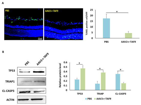 To explore the role of TAF9 in the regulation of RGC death and survival, AAV2-rTAF9 was used to overexpress the TAF9 level in the rAION model. Four weeks after rAION, the numbers of TUNEL-positive cells in the PBS-treated and AAV2-r-TAF9-treated groups were 7.4 ± 2.7/HPF and 2.4 ± 1.7/HPF, respectively (Figure 8A). The number of TUNEL-positive cell was 3.1-fold lower in the AAV2-r-TAF9-treated group than that in the PBS-treated group (p < 0.05). Western blotting confirmed that the TP53 and TRIAP1 levels in the AAV2-r-TAF9-treated group were significantly increased, by 2.04- and 2.71-fold, respectively, compared to those in the PBS-treated group (Figure 8B, p < 0.05). Moreover, the cleaved-caspase 3 (Cl-casp3) level was reduced by 2.33-fold in the AAV2-rTAF9-treated group compared to that in the PBS-treated group (Figure 8B, p < 0.05).