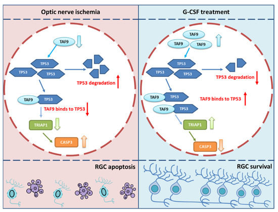The graphic abstract of the protective mechanism of G-CSF after ON infarct. G-CSF treatment induces the level of TAF9 to prevent TP53 degradation. The binding complex of TP53 and TAF9 induces the level of TRIAP1 to inhibit the level of cleaved CASP3; as a result, the RGC apoptosis is inhibited by treating G-CSF. (↑: increase; ↓: decrease).