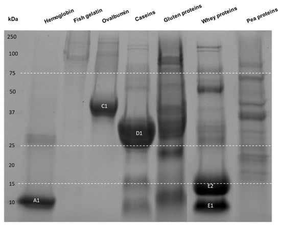 Apparent molecular mass distribution of the seven raw protein samples determined by SDS-PAGE. The amount of solubilized protein powder loaded was 17.4 µg for the hemoglobin and ovalbumin proteins; 69.6 µg for the caseins, whey, fish gelatin and pea proteins; and 522 µg for the gluten proteins. A1: α- and β-subunits of hemoglobin, C1: ovalbumin, D1: caseins, E1/E2: α-lactoglobulin/β-lactoglobulin.