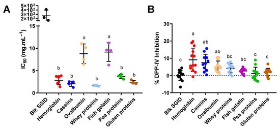 Digested proteins exert different DPP-IV-inhibitory activity in intestinal cells (Caco-2) before (A) and after (B) simulated IB passage. (A) The IC50 of digested proteins or blk SGID on DPP-IV activity was determined in live Caco-2 cells. The values are the mean of repeated measurement (N > 3). One–Way ANOVA analysis with Tukey’s post-hoc test (p < 0.0001) was performed. (B) the DPP-IV-inhibitory activity induced by the basal media after 1.5 h incubation with the digested proteins (31.25 mg·mL−1). The values are the means of 12 repeated measurements (N = 4 in triplicate). Statistical analysis was performed using one–Way ANOVA analysis with Tukey’s post-hoc test (p < 0.05). The means without a common letter are statistically different.