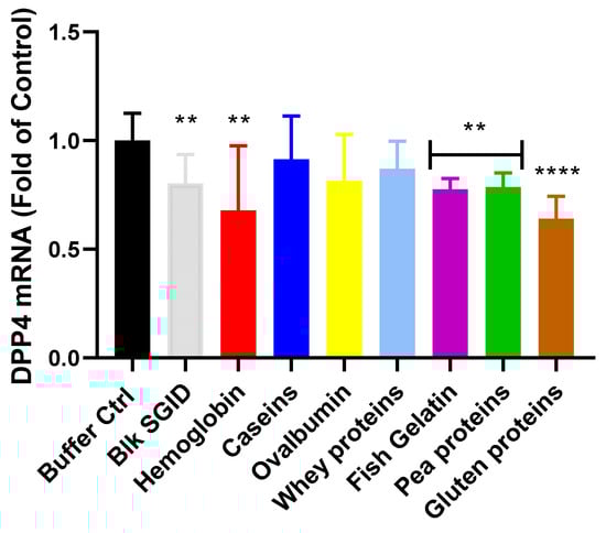 In order to investigate the effect of dietary proteins on DPP-IV gene expression at the intestinal level, in vitro digested proteins were incubated for 4, 12 and 24 h with the Caco-2/HT29-MTX cocultured cells. No significant differences were seen between the groups incubated for 4 and 12 h and the control. However, significant differences were observed after 24 h incubation (Figure 4). All of the digested proteins, except the dairy proteins and ovalbumin, inhibited DPP-IV mRNA expression. Digested gluten proteins decreased DPP-IV mRNA expression by 36% (p < 0.0001), while hemoglobin, fish gelatin and pea proteins, as well as blk SGID, decreased DPP-IV mRNA expression by about 25% (p < 0.01) compared to the buffer Ctrl (Figure 4). However, the digested proteins did not induce any significant mRNA expression changes compared to blk SGID (p > 0.05).