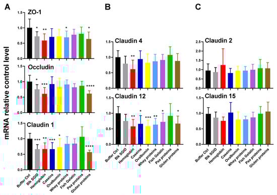 The digested samples tended to decrease the gene expression of TJ protein genes, particularly genes encoding ZO-1, Occludin, and Claudin 1 and 12. Digested hemoglobin decreased the gene expression of all of the TJ proteins (p < 0.01) except for Claudin 2 and 15. None of the digested proteins influenced the expression of genes encoding Claudins 2 and 15. Digested gluten caused the most significant drop in gene expression of Occludin and Claudin 1, by 39 and 44%, respectively (p < 0.0001), and significantly decreased Claudin 12 expression (p = 0.03). Digested caseins and ovalbumin significantly reduced ZO-1 and Claudin 1 and 12 gene expression (0.05 < p < 0.001), and digested whey protein significantly decreased ZO-1 and Claudin 12 gene expression (p = 0.006 and p = 0.005, respectively). Blk SGID also significantly reduced the gene expression of ZO-1, Occludin, and Claudin 1 (p = 0.011, p = 0.028, and p = 0.0005, respectively). Finally, contrary to the other digested proteins, pea proteins had no significant effect on TJ protein gene expression.