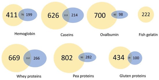 The hemoglobin and ovalbumin protein samples were the purest in terms of protein content. Indeed, very few peptides other than the α and β-subunits of hemoglobin or ovalbumin were identified by MS. The SDS-PAGE confirmed these results, showing two main bands (A1 for the α and β-subunits of hemoglobin and C1 for ovalbumin). The proteomics analysis of the fish gelatin sample allowed the identification of fibrillar and α type 1 collagen with only 16 identified peptides. In addition, the electrophoretic analysis of this sample was made difficult by the poor quality of the migration, probably due to high-molecular-weight gelatin. Regarding the milk protein samples, the caseins and whey proteins each contained the same proteins but in different abundance, either more caseins (D1) or more whey proteins (E1 and E2), which was in line with their process of extraction (see the M&M section). The plant protein samples were a mixture of proteins like glutenin and gliadin for the gluten sample; legumin, vicilin, convicilin, provicilin, lectin, and albumins for the pea protein sample; and other protein constituents such as antinutritional factors or enzymes, as revealed by the proteomic analysis and by the presence of numerous distinct bands at different molecular masses in the gel electrophoretogram.