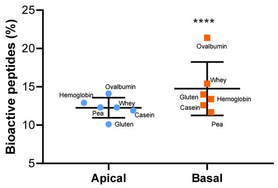 The richness in potential DPP-IV-inhibitory peptides increases during the IB transfer. The values are the percentage of bioactive peptides (with predicted DPP-IV IC50 < 300 µg·mL−1) for each experimental condition in each compartment (apical/basal). The statistical analysis was performed using a one-sample t test (**** p < 0.0001) between the basal and apical means.