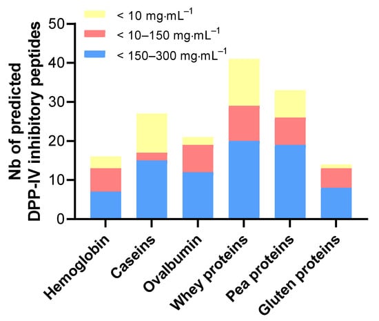 Figure 8 shows that, for all protein samples, the gastrointestinal digestion and the hydrolysis occurring during the IB passage generated peptides with high predicted DPP-IV-inhibitory activity. The digestion of pea and whey proteins yielded a greater variety of DPP-IV-inhibitory peptides—approximately twice as many as that of hemoglobin, ovalbumin, and gluten proteins.