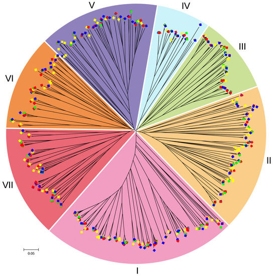 In total, 667 8CM sequences of nsLTP proteins from B. napus, B. rapa, B. oleracea and A. thaliana (Table S5), were utilized to construct the phylogenetic tree. Evolutionary analysis showed that these 667 nsLTP proteins from four species were separated into seven groups: I, II, III, IV, V, VI and VII (Figure 2). As shown in Table 1, these seven groups all existed in three Brassica species and A. thaliana. In total, there were 170 nsLTP genes from four species in group I, 118 in group II, 68 in group III, 46 in group IV, 98 in group V, 80 in group VI, and 87 in group VII.