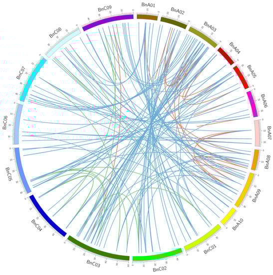Genome-wide synteny analysis for nsLTP genes in B. napus. BnA01–10 and BnC01–09 represented chromosomes in A and C sub-genomes in B. napus, respectively. Red, green and blue lines linked the syntenic gene pairs within BnA-BnA, BnC-BnC and BnA-BnC subgenomes of B. napus, respectively.