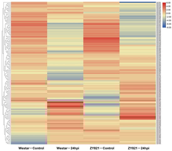 Expression patterns of BnLTP family genes in the leaves of susceptible (Westar) and tolerant (ZY821) genotypes of rapeseed infected with S. sclerotiorum at 24 h post-inoculation (24 hpi).