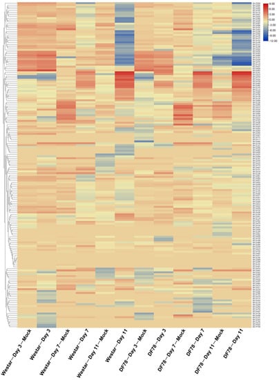 Expression patterns of BnLTP family genes in the cotyledons of rapeseed resistant (DF78) and susceptible (Westar) lines at 0, 3, 7 and 11 days post-L. maculans inoculation.