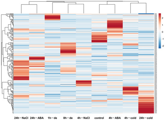 The heatmap of the expression levels of BnLTP family genes in 3 week-old plants of rapeseed under multiple abiotic stresses (NGDC project ID CRA001775), including dehydration (1 h and 8 h), ABA (25 μM; 4 h and 24 h), NaCl (200 mM; 4 h and 24 h), and cold (4 °C, 4 h and 24 h).