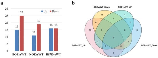 The numbers of BnLTP family DEGs in transgenic rapeseeds (Westar cultivar) overexpressing pBAN::BnTT1 (BOE, 20 DAP seeds, seed coat-specific promoter), pNapA::BnTT1 (NOE, 20 DAP seeds, seed embryo-specific promoter) and pNapA::BnbZIP67 (B67O, 25 DAP seeds, seed embryo-specific promoter) (a); Venn diagram of the numbers of BnLTP family DEGs in BOE and NOE (b).