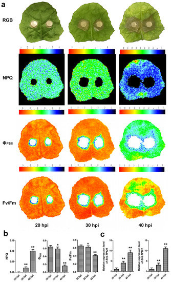 The impact of S. sclerotiorum infection on photosynthesis of rapeseed leaves (a,b); and the qRT-PCR expression level of two top Sclerotinia-responsive BnLTP genes, BnLTP129 and BnLTP161 (c). Standard images of the RGB, Fv/Fm, ΦPSII and NPQ from S. sclerotiorum-infected rapeseed leaves at 20, 30 and 40 hpi. A false color scale is used for each parameter. The values represent the average ± SD of 3 biological replicates. Fv/Fm, maximum quantum yield of PSII; ΦPSII, effective quantum yield of PSII; NPQ, non-photochemical quenching. * p < 0.05 and ** p < 0.01 compared with samples at 20 hpi.
