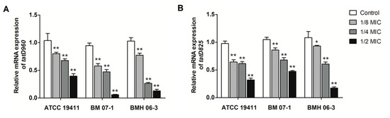 Luteolin exhibited an inhibitory effect on the mRNA expression of tatD genes in T. pyogenes. (A) The mRNA expression of tatD960, (B) the mRNA expression of tatD825. The concentrations of luteolin were 0, 1/8, 1/4, and 1/2 MIC, respectively. Data were presented as means ± SD. (* compared with control, * p < 0.05, ** p < 0.01).