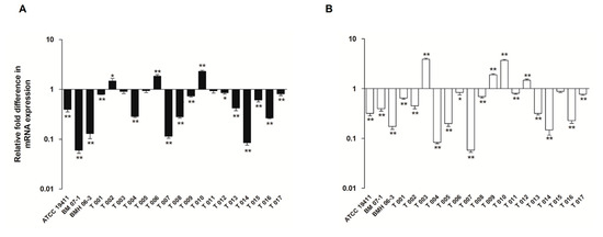 Treatment of the three T. pyogenes strains (ATCC19411, BMH06-3, and BMH07-1) with luteolin led to a decrease in the expression of the tatD960 and tatD825 genes. The luteolin at 1/2 MIC had the highest inhibitory effect on the mRNA expression of both tatD960 (0.06- to 0.4-fold change) and tatD825 genes (0.17- to 0.47-fold change) (Figure 2). Following the treatment of T. pyogenes with luteolin (1/2 MIC), mRNA expression levels of tatD960 were down-regulated in 85% of strains (n = 20), and the mRNA expression levels of the tatD825 were decreased in 80% of strains (n = 20) (Figure 3).