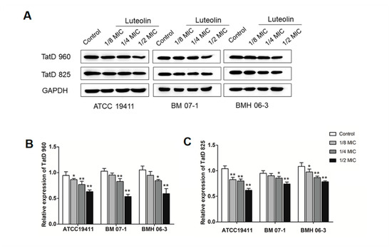 The protein expression results of TatD DNases are shown in Figure 3 and Figure 4, and 1/2 MIC of luteolin was most effective in inhibiting the expression of TatD DNases in T. pyogenes. It has been noted that protein expression of TatD960 and TatD825 were, respectively, decreased by 54–63% and 62–79% in the three T. pyogenes isolates (ATCC19411, BMH06-3, and BMH07-1) treated with luteolin at 1/2 MIC (Figure 4). After treatment by luteolin (1/2 MIC), protein expression levels of TatD960 were down-regulated in 90% of strains (n = 20), and the protein expression levels of the TatD825 were decreased in 80% of strains (n = 20) (Figure 5).