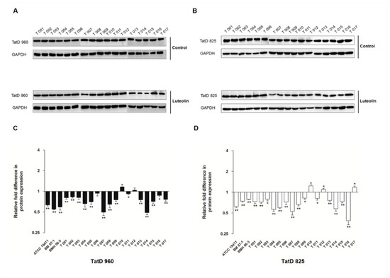The effect of luteolin on the expression of TatD DNases in 20 T. pyogenes. (A,B) Western blot results TatD DNases in T. pyogenes (T001–T017) with different treatment, (C) the expression of TatD960, (D) the expression of TatD825. T. pyogenes treated with luteolin at 1/2 MIC. Data were presented as means ± SD. (* compared with control, * p < 0.05, ** p < 0.01).