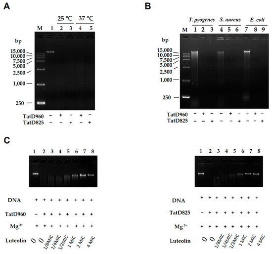 The genomic DNA was extracted from mouse livers and bacterial cells (T. pyogenes ATCC19411, E. coli ATCC25922, and S. aureus ATCC29213) using phenol/chloroform extraction, respectively. His-TatD 960 and His-TatD 825 recombinant proteins were expressed in E. coli BL21 (DE3) cells and purified using His GraviTrap (GE Healthcare, Uppsala, Sweden), as previously described by Zhang et al. [16]. The concentration of TatD proteins was quantified using a BCA Protein Assay Kit (Abcam). Our previous study showed that Mg2+ promotes the hydrolysis of DNA by TatD DNases of T. pyogenes. We added Mg2+ as an activator of TatD DNase in the DNA hydrolysis assay [16]. Mouse liver DNA (200 ng) was incubated with recombinant proteins (2 μM) in Mg2+ buffer (pH = 7.4; 5 mM) in a final volume of 20 μL for 1 h. Mg2+ buffer was used as a negative control. The reaction temperature was 25 and 37 °C. To investigate the effect of TatD DNases on bacterial DNA, genomic DNA extracted from bacterial cells was cultured with TatD proteins in Mg2+ buffer at 37 °C for 1 h. The cultured mixtures were analyzed using 0.8% agarose gel electrophoresis to determine the hydrolysis of DNA. TatD DNases (2 μM) and different concentrations (final concentrations: 0, 1/8, 1/4, 1/2, 1, 2 and 4 MIC; MIC = 156 μg/mL) of luteolin were added to Eppendorf tubes and supplemented with Mg2+ buffer (pH = 7.4; 5 mM) to 20 μL. The mixtures were incubated at 37 °C for 30 min. Two hundred nanograms of DNA from mouse livers were added to 20 μL reaction systems and incubated at 37 °C for 1 h. A 20 µL system containing only 200 ng of DNA in Mg2+ buffer was used as a control and the cultured mixtures were electrophoresed on a 0.8% agarose gel. The effect of luteolin on the hydrolysis of plasmid by TatD DNases was also tested. The pBR322 plasmid (1 µg/mL) was purchased from TaKaRa Biomedical Technology Co., Ltd. (Dalian, China). Luteolin (final concentration: 2 MIC) was respectively incubated with TatD DNases (2 μM) with 5 mM Mg2+ in PBS (pH = 7.4) in a total volume of 20 μL at 37 °C for 30 min. Meanwhile, the TatD DNases (2 μM) in Mg2+ buffer and PBS (pH = 7.4) were added to 20 μL systems at 37 °C for 30 min. Two hundred nanograms of plasmid pBR322 were added to 20 μL reaction systems and incubated at 37 °C for 1 h. Then, the mixtures were electrophoresed on a 0.8% agarose gel and visualized by Azure c300 imaging system.