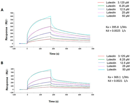 Binding of luteolin and TatD DNases in SPR assays. Luteolin was tested in various concentrations (3.125–50 µM). (A) Kinetic analysis of luteolin and TatD960, (B) kinetic analysis of luteolin and TatD825.