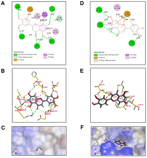 Predicted binding mode of luteolin docked into TatD DNases. (A,D) show the interactions between luteolin and TatD DNases in two-dimensional (2D) docking models, (B,E) show luteolin interacting with the amino acid residues located within the active sites of the TatD DNases pocket in three-dimensional (3D) docking models, (C,F) show binding locations of TatD DNases interacting with luteolin as molecular surface structures.