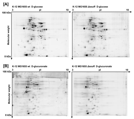 Surprisingly, the proteomic maps of the wild type E. coli K-12 MG1655 and its ΔexuR derivative did not differ in the spectrum of proteins, both in the cells growing with D-glucose (Figure 1A) and with D-glucuronate (Figure 1B).