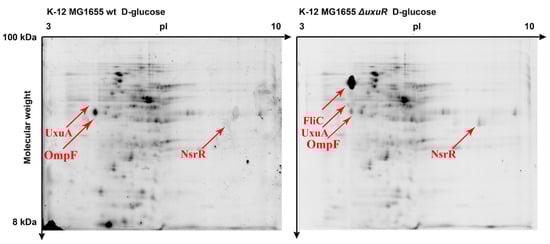 Unlike the previous case, the comparison of the proteomic maps of the wild type E. coli K-12 MG1655 and E. coli K-12 MG1655 ΔuxuR revealed several proteins with significantly changed levels. Rather predictably, these proteins were different during the growth with D-glucose (Figure 2 and Table 1) and D-glucuronate (Figure S2 and Table 2).