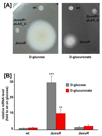 To check whether UxuR has an effect on bacterial motility, we measured the mobility zones of the wild type strain and its ΔuxuR derivative during growth with the addition of D-glucose or D-glucuronate (Figure 3A).