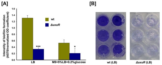 Inhibition of bacterial motility by UxuR highlights the importance of the Ashwell pathway for the colonisation of host organisms. Colonisation processes are normally accompanied by the formation of bacterial biofilms that help bacteria to survive in harsh conditions. Figure 4 illustrates the influence of uxuR deletion on the relative intensity of biofilm formation. As expected, UxuR is necessary for the effective generation of biofilms, especially during growth on rich LB medium (Figure 4A,B).