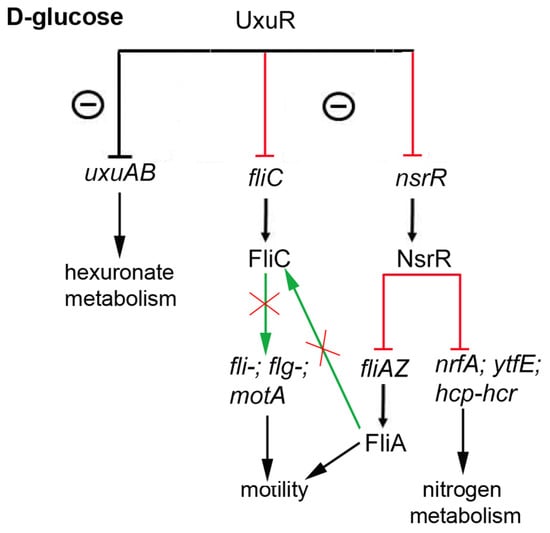 Increased level of the NsrR transcription factor was far less predictable (Table 1). Although the difference between the strains was not very significant (score of 40), it deserves some attention because transcription factors are normally present in the cells in small amounts and thus are poorly detected in the proteomes. The nsrR gene does not belong to the UxuR regulon which is rather small [,]. However, in many strains of Salmonella enterica, the gene coding for the HCP protein is located in close proximity to uxuR (microbesonline.org), which assumes a possible involvement of UxuR in the regulation of nitrogen metabolism (Figure 5). NsrR, in contrast, controls the expression of 34 operons of different functionality, including five local (dsdC, feaR, fhlA, norR, pdhR) and at least one global (lrp) transcriptional regulator. According to the information in RegulonDB [], the strongest inhibitory effect of NsrR was detected for just four genomic loci; among them, two operons of nitrogen assimilation (nrfABCDEFG and hcp-hcr-poxB-ltaE-ybjT), the ytfE gene with mutations leading to a sensitivity of E. coli to nitric oxide [,], and the fliAZ-tcyJ operon. fliA encodes for a σ-factor, controlling all flagellar genes, including fliC. Due to that, the enhanced levels of NsrR should inhibit transcription from fliA and, hence, fliC. However, we observed the opposite effect. This might indicate that NsrR participates in flagellin biogenesis, sustaining its production at an optimal level. However, the question about molecular mechanisms leading to the accumulation of FliC in the mutant cells remains open. Another interesting question that still needs an answer is how a bacterial cell with the uxuR deletion decides whether to form a biofilm or not.