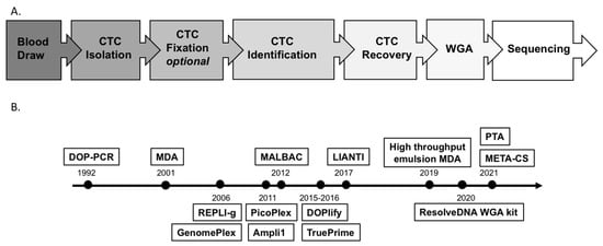 Circulating and disseminated tumor cells (CTCs and DTCs) are cancer cells that dissociate from primary and metastatic cancer sites and enter the circulation with potential to seed distant metastases. CTCs can be enriched or isolated from a simple blood liquid biopsy. Such biopsies are economic and repeatable, allowing the monitoring of changes in cancer longitudinally. Moreover, it is broadly recognized that cancers are heterogeneous [1]; liquid biopsies enable sampling of CTCs released from many tumor sites in comparison to a small, isolated tissue sample, which would not be representative of the entire tumor burden. Heterogeneity may develop early during cancer development. In general, alterations in tumor suppressors or oncogenes predispose cells to cancerous transformation, and such genes, often referred to as “driver genes”, grant mutated cells growth and survival advantages [1]. Due to common genetic instability, cancer cells further acquire and accumulate genomic changes, such as copy number variations (CNVs) or other genetic mutations, over time which can pass on to “daughter” cells. Often, cells at this stage carry their own unique mutation signatures and thus generate heterogeneity. Some of these changes may prove to be beneficial in resistance to therapeutic drugs. Indeed, it has been shown that cancers with a high tumor mutation burden (the number of different genetic changes acquired) are more likely to be treatment-resistant but respond to immue checkpoint inhibitor therapy [2]. For example, higher mutational load (top 20% highest TMB quintile) predicts better survival across diverse cancer types tested, except for glioma, and this is relevant in patients treated with either anti-PD-1 (programmed cell death protein 1) or anti-CTLA-4 (cytotoxic T lymphocyte-associated antigen-4) therapies [3]. Thus, single-CTC/DTC analysis provides a strategy to characterize cancer heterogeneity, cancer evolution and metastatic potential, as well as to predict and monitor developing resistance and guide best personalized therapy [4,5]. However, an intrinsic property of CTCs is their rarity, posing technical challenges for the isolation of CTCs for single-cell analysis [6]. The entire genomic content of a normal human cell is about 6–10 pg [7], which is insufficient for most genomic analyses, as a larger quantity of DNA is essential to generate high-quality libraries for sequencing or retain reliable data for most mutation detection assays. Therefore, whole genome amplification (WGA) has become a prerequisite to obtain sufficient genetic material from single CTC to perform genetic analysis [8]. In this review, we evaluate WGA- and CTC-related studies published in the last decade (2012–2022) with a focus on the recent advances in CTC isolation and recovery and the technical advances in WGA, and we further analyze studies on the main cancer types that combined CTC analysis with WGA.