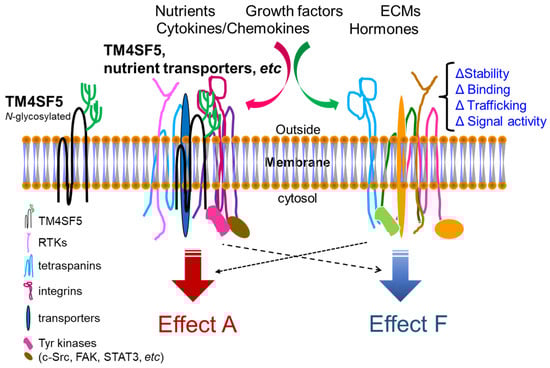 Similar to genuine tetraspanin family members, TM4SF5 has four transmembrane (TM) domains: two short cytosolic N- and C-terminal tails and two extracellular loops (SEL and LEL) [,]. Meanwhile, the difference between TM4SF5 and the tetraspanins is that TM4SF5 includes no CCG residues and has relatively nonconserved sequences in the LEL. Because other tetraspanins can translocate to cellular membranes, including exosomal membranes, TM4SF5 can also be involved in cellular or environmental processes [,,,,]. Tetraspanins form complexes with other receptors at tetraspanin-enriched microdomains (TERMs) or tetraspanin webs for the regulation of diverse cellular functions []. Similarly, TM4SF5 also interacts with proteins, including the growth factor receptors EGFR [], IGFR [], cytokine receptor (IL-6Rα) [,], and integrins [,] and also with solute carrier (SLC) family transporters [,,]. The interaction or association of TM4SF5 with diverse membrane proteins (when forming TM4SF5-enriched microdomains, T5ERMs) may, therefore, be dynamically modulated, depending on the intracellular signaling and/or extracellular environment of specific cells. Following dynamic changes in intracellular and/or extracellular metabolic situations, TM4SF5 may change its intracellular localization and binding partners to regulate the expression, stability, binding, and activity of binding partner proteins in T5ERMs in a spatiotemporal manner [] (Figure 2).