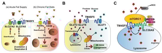 Metabolic regulation by TM4SF5. TM4SF5 can alter the metabolism of lipids, glucose/fructose, and arginine, resulting in the development of various features of chronic liver diseases. (A) Depending on the acute or chronic fatty acid or the fat supply, TM4SF5 in hepatocytes may negatively or positively support the transport activities of the fatty acid transporters via associations with the transporters, respectively. In case of acute supply, hepatocyyte TM4SF5 expression appears to reduce the fatty acid trasporting activity of SLC27A2 and SLC27A5, leading to less fat accumulation in the cells, whereas chronic intake of excess fatty acids leads to TM4SF5-mediated nonalcholoic steatohepatitis due to increased fatty acid uptake and accumulation. (B) When excessive fructose is available, TM4SF5 in hepatocytes causes GLUT8 from endosomal membranes to move toward plasma membranes following its release from their interaction, leading to increased GLUT8-mediated fructose uptake and, eventually, de novo lipogenesis (DNL). (C) Depending on the availability of extracellular (and thereby lysosomal) L-arginine, TM4SF5 binds to and causes mTOR to be translocated to lysosomal membranes, where TM4SF5 localizes and also binds to the L-arginine transporter (SLC38A9, solute carrier family 38 member 9) at the lysosome. The binding affinity of L-arginine to TM4SF5 is greater than that to SLC38A9, leading to the sensing of physiological L-arginine levels in the lysosomal lumen, enough for the export of L-arginine via SLC38A9 to the cytosol. This causes mTOR and S6K1 activation and, eventually, HCC development. FATPs, fatty acid transport proteins; CD36, fatty acid translocase; SREBP1, sterol regulatory element-binding protein 1; GLUT, glucose transporter; mTORC1, mechanistic target of rapamycin complex 1.