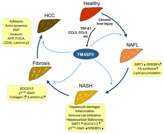 TM4SF5-mediated liver disease development. Healthy livers can be injured by different stimuli, including excessive nutrients, leading to lipid toxicity and hepatocyte damage. Following chronic damage, components of the inflammatory environment, including TGFβ1, CCL, CCL5, etc., can induce TM4SF5 expression in hepatocytes. Enhanced TM4SF5 can play roles in the regulation of the immunometabolic pathway and activity, consequently leading to the development of nonalcoholic steatosis (NAFL) with increased lipid uptake and accumulation, nonalcoholic steatohepatitis (NASH) with further inflammation and immune cell infiltration, fibrosis with STAT3-mediated extracellular matrix (i.e., collagen type I, laminin γ2, etc.) deposition, and eventually, hepatocellular carcinoma (HCC) with increased expression levels of AFP (α-fetoprotein), FUCA (α-L-Fucosidase 1), CD34 (CD34 antigen), laminin γ2, etc. TM4SF5-positive HCC can have features of the epithelial–mesenchymal transition (EMT) and actin reorganization, increasing the metastatic potential through the promotion of migration and invasion. Each dotted arrow indicates TM4SF5-mediated effects on the pathological development or progression. SOCS1/3, suppressor of cytokine signaling 1/3; STAT3, signal transducer and activator of transcription 3; SIRT1, Sirtuin 1; SREBPs, sterol regulatory element binding proteins; CCL2/5, C-C motif chemokine ligand 2/5; TGFβ1, transforming growth factor β1.