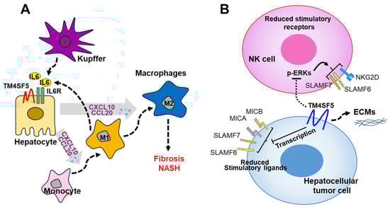 We recently reported that TM4SF5 plays a role in the communication between hepatocytes and MFs or NK cells, and the possible influence of this on the inflammatory microenvironment and immune system may lead to the development of NAFLD and HCC. These traits are also much more pronounced in the livers of Tm4sf5-expressing WT mice than in those of Tm4sf5−/− knockout mice in methionine–choline-deficient diet-induced NASH mouse models [] or in a diethylnitrosamine-induced HCC mouse model []. Regarding the roles of TM4SF5 in NASH and HCC development, in hepatocytes, TM4SF5 is involved in crosstalk with immune cells, in particular, macrophages (MFs) [] and NK cells [], which are critical for the development of an inflammatory environment in NASH or HCC associated with fibrosis. One report recently showed that TM4SF5 expression in HCC tissues was negatively related to tumor malignancy when the tissues were immunostained using a commercial antibody [], which was not specific for endogenous or exogenic human TM4SF5 during tissue and cell immunostaining in our hands. TM4SF5 can induce inflammatory cytokines and chemokines, including TGFβ1, CCL2, and CCL5 and can induce TM4SF5 in hepatocytes [,], forming positive feedback between TM4SF5 and the cytokines. In addition to the induction of TM4SF5 expression through the secretion of proinflammatory chemokines, TM4SF5 expression can be induced during the differentiation or activation of MFs and enhances glycolysis in MFs during the polarization of M1-type MFs, leading to the formation of a proinflammatory environment. Activated M1-type MFs secrete proinflammatory interleukin-6 (IL-6), which induces the secretion of CCL20 and CXCL10 from TM4SF5-positive hepatocytes []. Under conditions of chronic inflammation with positive bidirectional crosstalk, TM4SF5 in hepatocytes can reprogram the M1-type MFs to be M2-type, profibrotic MFs [] (Figure 4A).