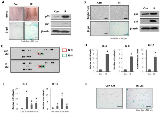 Figure 1. The effects of radiation-induced SASP on adjacent cells and radiation ulcers. (A) Representative gross and SA-β-gal staining images (left), as well as p53 and p21 expression levels (right), in mouse skin 10 days after radiation exposure. Three mice per group were used. (B) Representative cell morphological and SA-β-gal staining images (left), as well as p53 and p21 expression levels (right), in HDFs after radiation exposure. (C) Cytokine screening in conditioned medium from control HDFs (Con-CM) and conditioned medium from irradiated HDF (IR-CM). (D) mRNA levels of IL-6, IL-8, and IL-1β in HDFs after radiation exposure. Data are presented as mean ± standard deviation with statistical significance set at * p < 0.05 vs. control group (Con). (E) mRNA levels of IL-6 and IL-1β in mouse skin after radiation exposure. Data are presented as mean ± standard error, with statistical significance set at * p < 0.05 vs. control group (Con). Six mice per group were used. (F) Representative SA-β-gal staining images in HDFs cultured in Con-CM and IR-CM for 3 days.