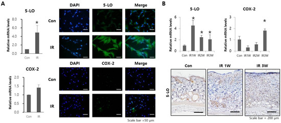 Figure 2. Expression of 5-LO and COX-2 in HDFs and mouse skin tissue after radiation exposure. (A) mRNA expression levels and representative immunostaining images of 5-LO (top) and COX-2 (bottom) in HDFs after radiation exposure. Data are presented as mean ± standard deviation, with statistical significance set at * p < 0.05 vs. control group (Con). (B) mRNA expression levels of 5-LO and COX-2 (top), as well as representative immunostaining images of 5-LO (bottom) in mouse skin after radiation exposure. Data are presented as mean ± standard error, with statistical significance set at * p < 0.05 vs. control group (Con). Six mice per group were used.