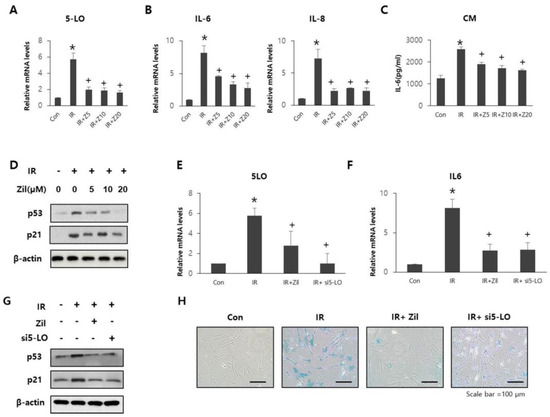Figure 3. Attenuation of radiation-induced cell senescence and SASP through 5-LO inhibition. (AD) HDFs were cultured with various concentrations of zileuton (0, 5, 10, or 20 μM) for 24 h after radiation exposure (Con: control, IR: irradiation group, Z5: 5 μΜ zileuton treatment, Z10: 10 μΜ zileuton treatment, Z20: 20 μΜ zileuton treatment). (A,B) mRNA expression levels of 5LO, IL-6, and IL-8 in HDFs. Data are presented as mean ± standard deviation with statistical significance set at * p < 0.05 vs. control group (Con), + p < 0.05 vs. irradiated group (IR). n = 3; ANOVA (analysis of variance). (C) Secreted IL-6 levels in CM from HDFs. Data are presented as means ± standard deviation, with statistical significance set at * p < 0.05 vs. control group (Con), + p < 0.05 vs. irradiated group (IR). n = 3; ANOVA (analysis of variance). (D) p53 and p21 expression levels in HDFs. (EH) HDFs were treated with zileuton (Zil) or transfected with the siRNA targeting si5-LO (si5-LO). (E,F) mRNA expression levels of 5-LO and IL-6 in HDFs. Data are presented as mean ± standard deviation, with statistical significance set at * p < 0.05 vs. control group (Con), + p < 0.05 vs. irradiated group (IR). n = 3; ANOVA (analysis of variance). (G) p53 and p21 expression levels in HDFs. (H) Representative SA-β-gal staining images in HDFs.
