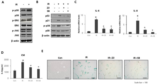 Figure 4. Effects of p38 inhibition on radiation-induced senescence. (A) HDF cells were exposed to 10 Gy radiation. After 24 h, levels of p-ERK, ERK, p-p38, p38, p-JNK, and JNK were assessed by Western blotting. (BE) HDF cells were irradiated and further treated with zileuton (Zil) or SB203580 (SB). (B) p53, p21, p-p38, and p38 expression levels in HDFs. (C) IL-6 and IL-8 mRNA levels in HDFs. Data are presented as mean ± standard deviation, with statistical significance set at * p < 0.05 vs. control group (Con), + p < 0.05 vs. irradiated group (IR). n = 3; ANOVA (analysis of variance). (D) Secreted IL-6 levels in CM from HDFs. Data are presented as mean ± standard deviation. * p < 0.05 vs. control group (Con), + p < 0.05 vs. irradiated group (IR). n = 3; ANOVA (analysis of variance). (E) Representative SA-β-gal staining images in HDFs.