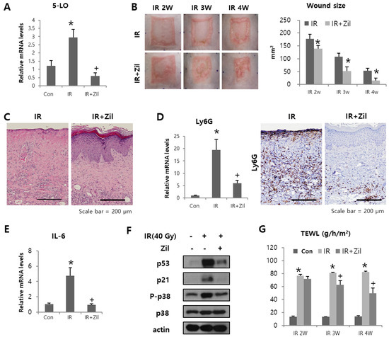 Figure 5. Effect of zileuton in a mouse model of radiation skin injury. Six mice per group were used. (A) 5-LO mRNA levels in mouse skin in control (Con), irradiated (IR), and zileuton-treated irradiated (IR+Zil) mice. Data are presented as mean ± standard error, with statistical significance set at * p < 0.05 vs. control group (Con), + p < 0.05 vs. irradiated group (IR). (B) Representative gross images of mouse skin and quantification of wound size. Data are presented as mean ± standard error, with statistical significance set at * p < 0.05 vs. irradiated group (IR). (C) Hematoxylin and eosin (H&E) staining of mouse skin. (D) mRNA levels (left) and representative immunostaining images (right) of Ly6G in mouse skin. Data are presented as mean ± standard error, with statistical significance set at * p < 0.05 vs. control group (Con), + p < 0.05 vs. irradiated group (IR). (E) mRNA levels of IL-6 were measured by qRT-PCR. Data are presented as mean ± standard error, with statistical significance set at * p < 0.05 vs. control group (Con), + p < 0.05 vs. irradiated group (IR). (F) Western blot analysis of p53, p21, p-p38, and p38 expression levels of mouse skin. (G) Transdermal water loss values of mouse skin. Data are presented as mean ± standard error, with statistical significance set at * p < 0.05 vs. control group (Con), + p < 0.05 vs. irradiated group (IR).