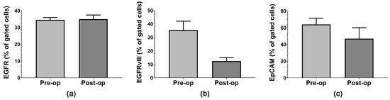 Our flow cytometric analysis revealed that Annexin-V-positive MVs express GB-specific markers: EGFR, EGFRvIII and EpCAM (Figure 2). There was no difference in EGFR expression on MVs’ surface between the Pre-op and Post-op groups (Figure 2a). EGFRvIII expression decreased (2.85 times) after the surgical resection of GB tumors (Figure 2b), in agreement with results reported by Skog et al. [13], and EpCAM expression decreased slightly (1.36 times) after surgery (Figure 2c). Although we did not find statistically significant differences between the Pre-op and Post-op groups, these results are consistent with previously published reports [13,34] which show high variability in surface GB markers’ expression between patients, most likely depending on the molecular profiles of their tumors.