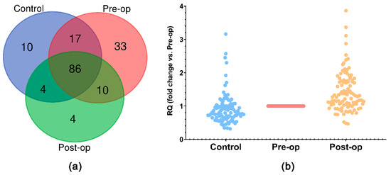 (a) Venn diagram of miRNAs identified in the 3 groups of subjects using TaqMan OpenArray; (b) scatter-plot of RQ values (fold change vs. Pre-op) for miRNAs identified in the 3 groups using TaqMan OpenArray.