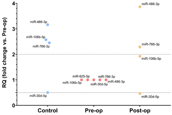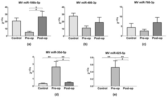 The levels of hsa-miR-106b-5p (ID 000442), hsa-miR-30d-5p (ID 000420), hsa-miR-486-3p (ID 002093), hsa-miR-625-5p (ID 002431) and hsa-miR-766-3p (ID 001986) were measured in MVs and plasma samples using the TaqMan technology. RT was performed on a Veriti 96-Well Thermal Cycler using the TaqMan MicroRNA Reverse Transcription Kit and TaqMan miRNA assays (all from Applied Biosystems, Thermo Fisher Scientific, Waltham, MA, USA). For miRNAs isolated from MVs, the TaqMan™ PreAmp Master Mix (Applied Biosystems, Thermo Fisher Scientific, Waltham, MA, USA) was used for pre-amplification without introducing amplification bias to the sample, according to the manufacturer’s instructions. Real-time quantitative PCR was performed on a QuantStudio 12K Flex Real-Time PCR System, using TaqMan miRNA assays and the TaqMan Gene Expression Master Mix (all from Applied Biosystems, Thermo Fisher Scientific, Waltham, MA, USA), according to the manufacturer’s instructions. Obtained data were analyzed using the QuantStudio 12K Flex Software v1.2 (Applied Biosystems, Thermo Fisher Scientific, Waltham, MA, USA) with the automatic Cq setting. MiRNA levels were calculated using the 2−ΔCq method [56] and multiplied by 103 (for plasma). The expression level of each miRNA of interest was normalized to the exogenous spike-in cel-miR-39-5p (ID 000200) for plasma or snRNU6 (ID001973) for MVs, as previously reported [35,57]. Pre-op and Post-op miRNA levels in MVs and plasma were compared in a patient-matched manner.